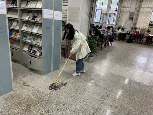 将书本归还至原位的同学放轻脚步穿梭在一个又一个书架之间,不放过任何角落,即使遇到找不到正确位置的情况,也没有将书本随意搁置,而是反反复复寻找,互相询问帮忙,直至找到书本的"家"。而打扫卫生的同学也是一丝不苟,桌子的每个角落,我们所踩的每一块地砖,都是仔仔细细地打扫,在保证质量的同时,也尽可能地放轻步伐不影响图书馆里学习的同学。