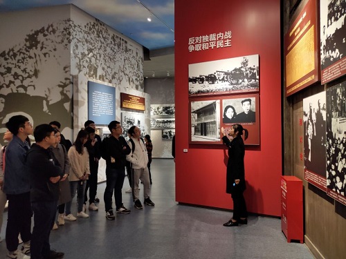 党史陈列馆布展以“敢教日月换新天-中国共产党湖南历史陈列”为主题,以历史轴线为脉络,讲述了“开辟新天地-新民主主义革命时期”、“描绘新画卷-全面建设社会主义时期”、“谱写新篇章-改革开放时期”三个不同历史时期发生的重大事件。其中还用专题形式,介绍了以毛泽东为代表的湘籍和长期在湘工作的优秀党史人物,其中包括党和国家领导人、人民军队高级将领、著名英烈代表、各领域杰出代表和历任湖南省委书记。同学们跟随讲解员的步伐,一步步地走进党史,了解党史,学习党史。
